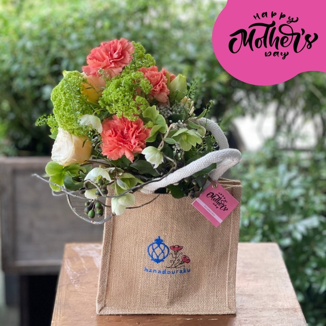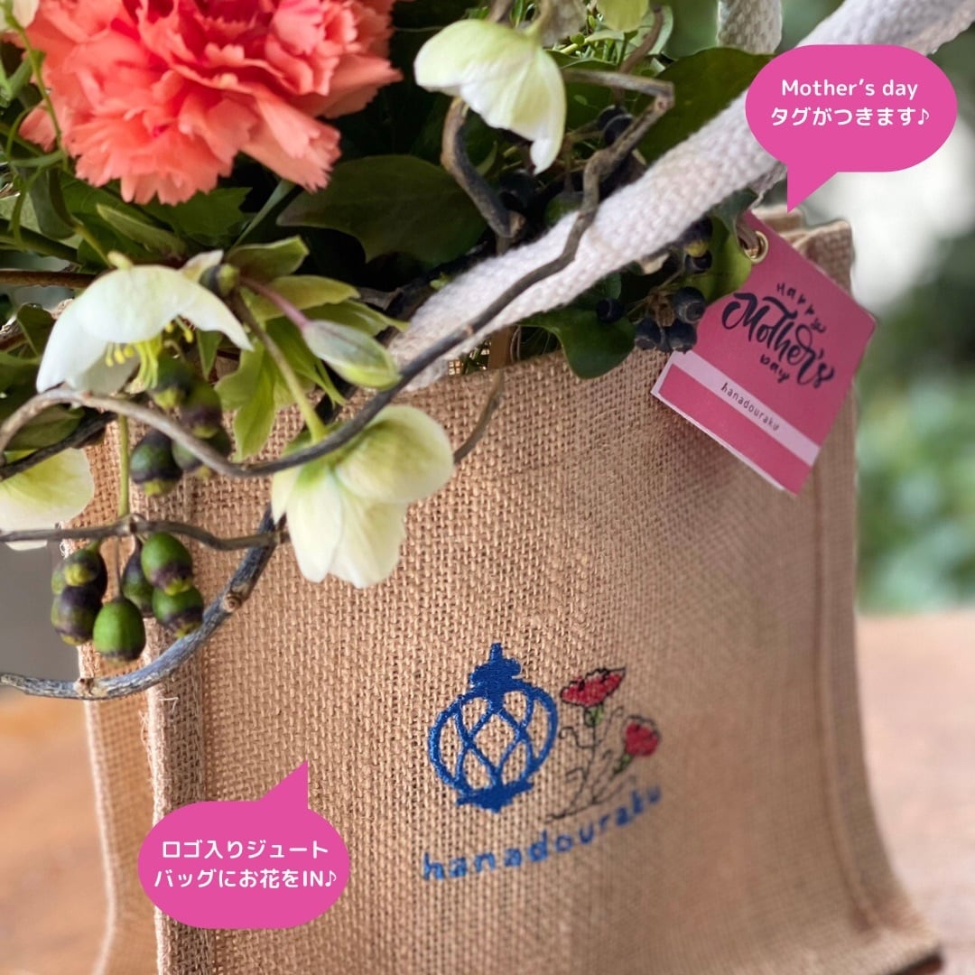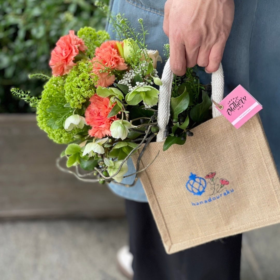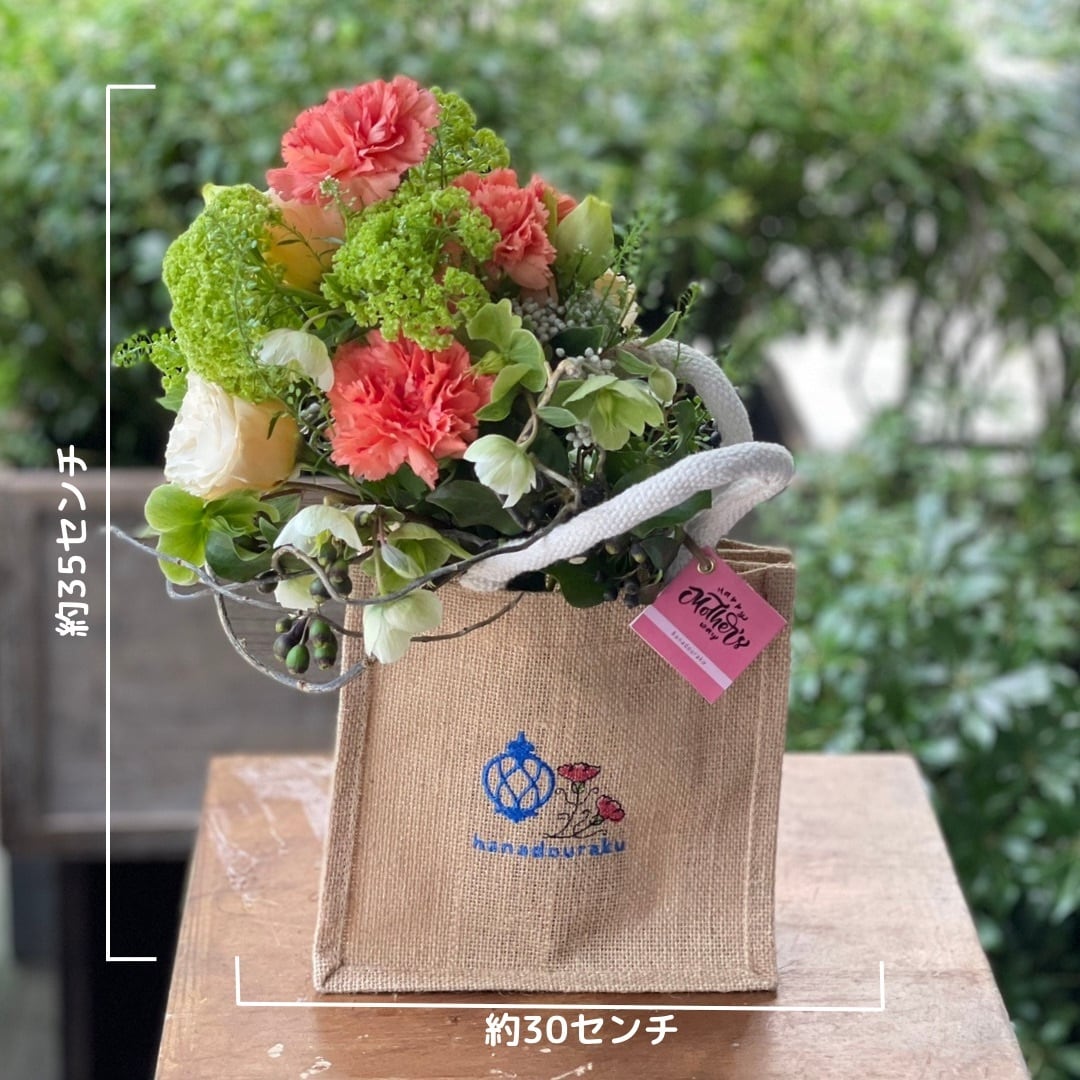 ナチュラル素材のバッグから、「ありがとう」のお花たちが溢れるようなアレンジメント。